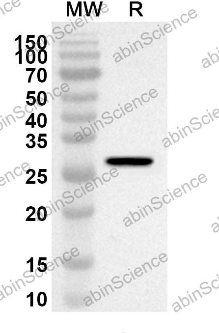 Western blot analysis was performed using anti-Monkeypox virus/MPXV A29L polyclonal antibody at 1ug/mL on recombinant Monkeypox virus/MPXV A29L (Catalog No. VK415022). |