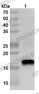 Western blot analysis was performed using anti-HPV52 E7/Protein E7 polyclonal antibody at 1ug/mL on recombinant HPV52 E7/Protein E7 (Catalog No. VK424022). |