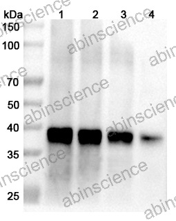 Western blot analysis was performed using anti-Langya virus Matrix protein polyclonal antibody at 1μg/ml on various samples. Lane 1: recombinant Langya virus/LayV M/Matrix (Catalog No: VK718012), 70 ug Lane 2: recombinant Langya virus/LayV M/Matrix (Catalog No: VK718012), 50 ug Lane 3: recombinant Langya virus/LayV M/Matrix (Catalog No: VK718012), 30 ug Lane 4: recombinant Langya virus/LayV M/Matrix (Catalog No: VK718012), 10 ug