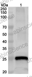 Western blot analysis was performed using anti-RABV-M polyclonal antibody at 1ug/mL on various samples. Lane 1: recombinant RABV M/Matrix protein (Catalog No: VK819012)