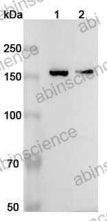 Western blot analysis was performed using anti-DST polyclonal antibody at 1ug/mL on various samples. Lane 1: Rat brain lysate Lane 2: Rat eye lysate