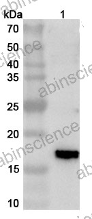 Western blot analysis was performed using anti-2-EP402R polyclonal antibody at 1ug/mL on various samples. Lane 1: recombinant ASFV EP402R (Catalog No: VK599012)