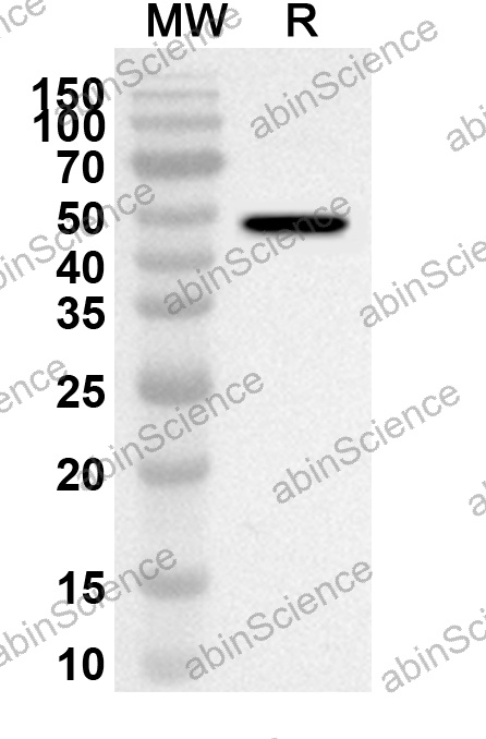 Western blot analysis was performed using anti-Treponema pallidum TPP47 polyclonal antibody at 1ug/mL on recombinant Treponema pallidum TPP47 (Catalog No. JN038012). |