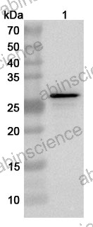 Western blot analysis was performed using anti-p30 polyclonal antibody at 1ug/mL on various samples. Lane 1: recombinant Mycoplasma pneumoniae P30 adhesin (Catalog No: JN837012)