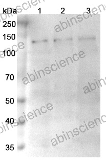 Western blot analysis was performed using anti-TRPM4 polyclonal antibody at 1μg/ml on various samples. Lane 1: Jurkat cell lysate Lane 2: PC12 cell lysate Lane 3: Rat brain lysate