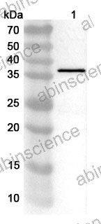Western blot analysis was performed using anti-A0A0H3NH94 polyclonal antibody at 1ug/mL on various samples. Lane 1: recombinant Salmonella schwarzengrund murG (Catalog No: JN088012)