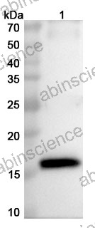 Western blot analysis was performed using anti-E7 protein polyclonal antibody at 1ug/mL on various samples. Lane 1: recombinant HPV18 E7 (Catalog No: VK556062)