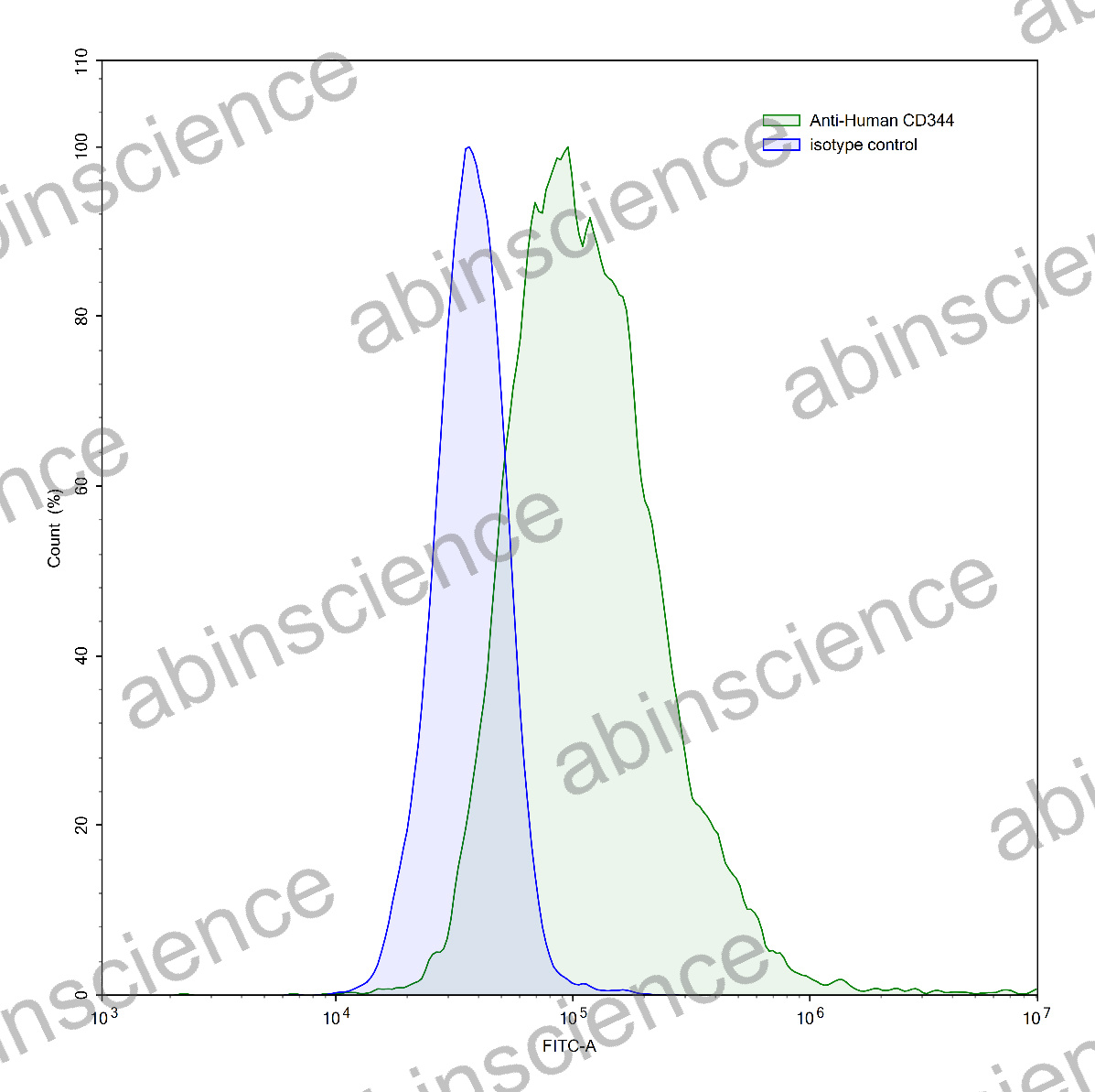 Flow-cytometry using anti-human CD344 antibody.HeLa cells were stained with an irrelevant antibody (Blue Histogram) or an anti-human CD344 antibody monoclonal antibody (Catalog # HV376107 ,Green Histogram) at a concentration of 5 µg/ml for 30 mins at RT. After washing, bound antibody was detected using a FITC conjugated goat anti-mouse antibody (Catalog # MF690414) and cells analysed on a NovoCyte Flow Cytometer. |