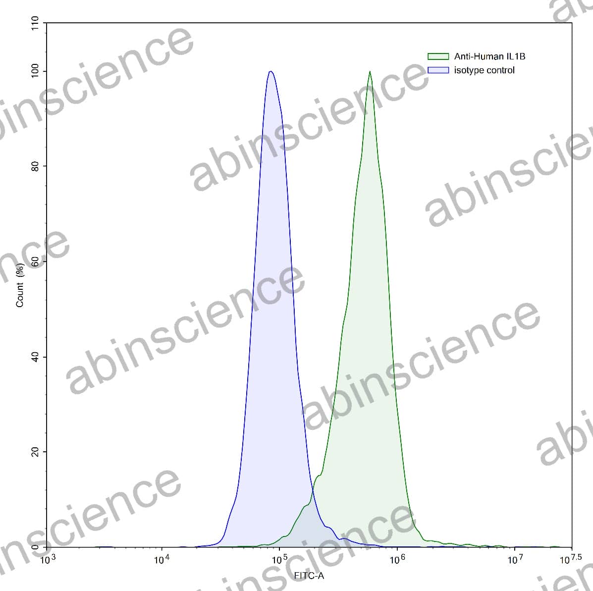 Flow-cytometry using anti-human IL1B antibody.LPS treated THP-1 cells were stained with an irrelevant antibody (Blue Histogram) or an anti-human IL1B antibody monoclonal antibody (Catalog # HF943107 ,Green Histogram) at a concentration of 5 ug/ml for 30 mins at RT. After washing, bound antibody was detected using a FITC conjugated goat anti-mouse antibody (Catalog # MF690414) and cells analysed on a NovoCyte Flow Cytometer. |