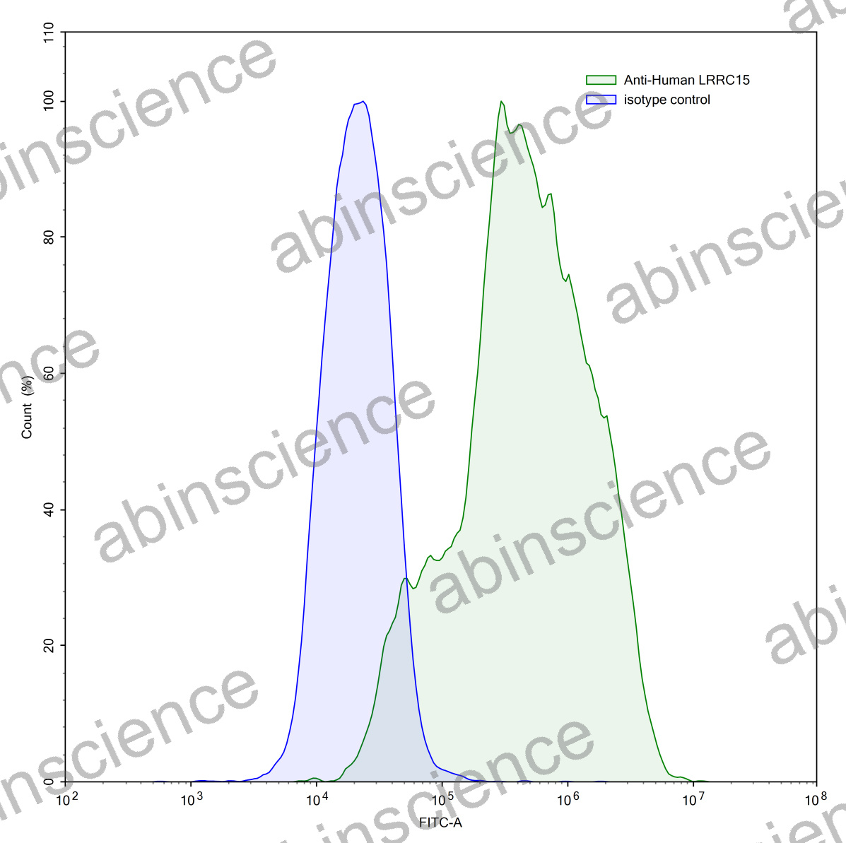 Flow-cytometry using anti-human LRRC15 antibody.LRRC15 Transfected CHO cells were stained with an irrelevant antibody (Blue Histogram) or an anti-human LRRC15 antibody monoclonal antibody (Catalog # HV777107 ,Green Histogram) at a concentration of 5 µg/ml for 30 mins at RT. After washing, bound antibody was detected using a FITC conjugated goat anti-mouse antibody (Catalog # MF690414) and cells analysed on a NovoCyte Flow Cytometer. |