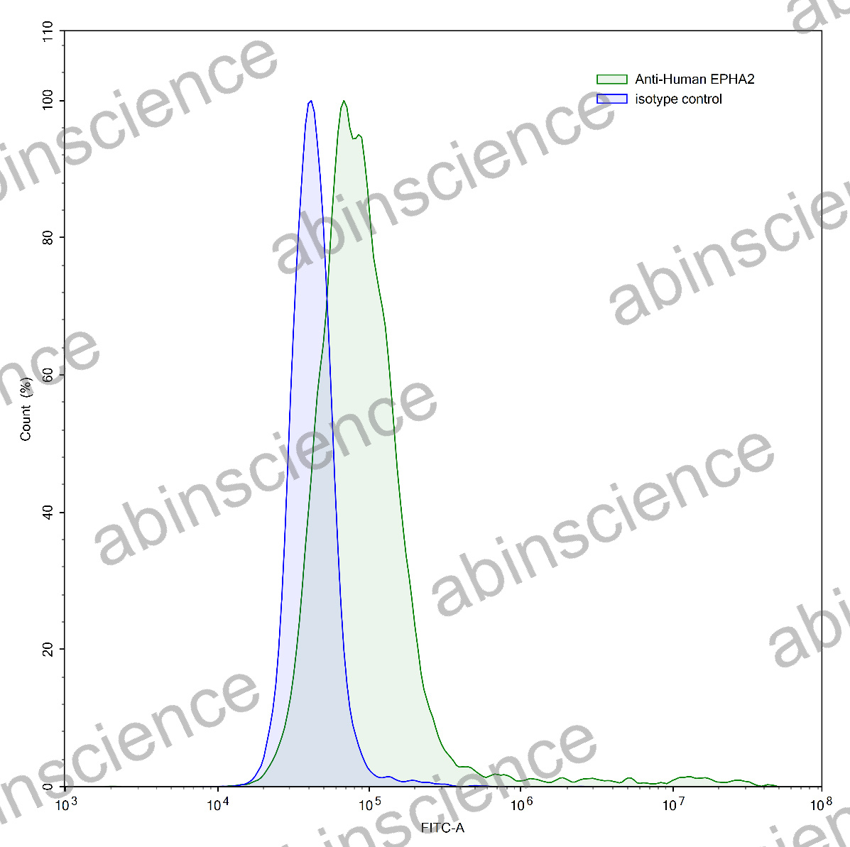 Flow-cytometry using anti-human EPHA2 antibody.A431 cells were stained with an irrelevant antibody (Blue Histogram) or an anti-human EPHA2 antibody monoclonal antibody (Catalog # HB738107 ,Green Histogram) at a concentration of 5 µg/ml for 30 mins at RT. After washing, bound antibody was detected using a FITC conjugated goat anti-mouse antibody (Catalog # MF690414) and cells analysed on a NovoCyte Flow Cytometer. |