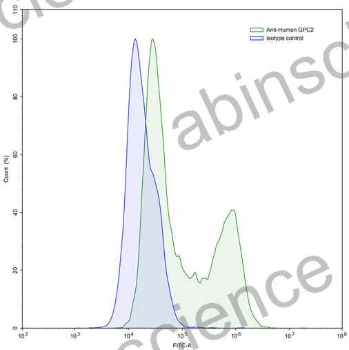 Flow-cytometry using anti-human GPC2 antibody. Human GPC2 Transfected CHO cells were stained with an irrelevant antibody (Blue Histogram) or an anti-human GPC2 antibody monoclonal antibody (Catalog # HP003207 , Green Histogram) at a concentration of 5 µg/ml for 30 mins at RT. After washing, bound antibody was detected using a FITC conjugated goat anti-mouse antibody (Catalog # PMB96441) and cells analysed on a NovoCyte Flow Cytometer.