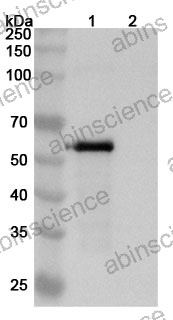Western blot analysis was performed using anti-PODXL monoclonal antibody at 1ug/mL on various samples. Lane 1: recombinant human PODXL (Catalog No: HT033012) Lane 2: negative control
