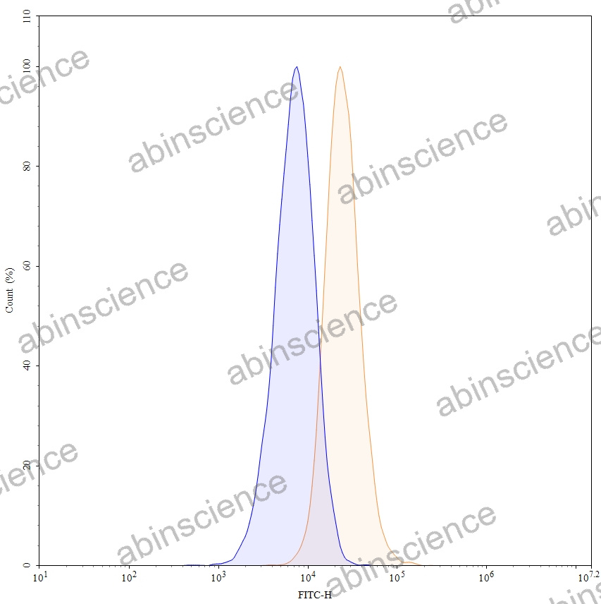 Flow-cytometry using FITC anti-human CD51 antibody. HepG-2 cells were stained with an irrelevant antibody (Blue Histogram) or an FITC anti-human CD51 monoclonal antibody (Catalog: HY065117, Yellow Histogram) at a concentration of 5 µg/ml for 30 mins at RT. After washing, cells analysed on a NovoCyte Flow Cytometer. |