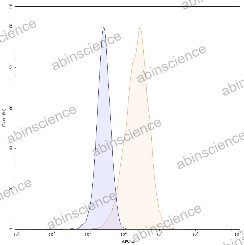 Flow-cytometry using APC anti-human CD54 antibody. RPMI-8226 cells were stained with an irrelevant antibody (Blue Histogram) or an APC anti-human CD54 monoclonal antibody (Catalog: HY321237, Yellow Histogram) at a concentration of 5 µg/ml for 30 mins at RT. After washing, cells analysed on a NovoCyte Flow Cytometer. |