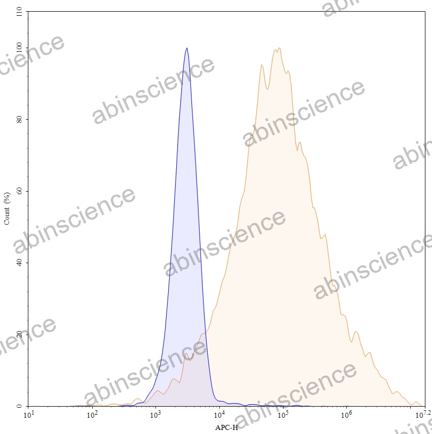 Flow-cytometry using APC anti-human CD51&CD61 antibody. HUVEC cells were stained with an irrelevant antibody (Blue Histogram) or an APC anti-human CD51&CD61 monoclonal antibody (Catalog: HY065237, Yellow Histogram) at a concentration of 5 µg/ml for 30 mins at RT. After washing, and cells analysed on a NovoCyte Flow Cytometer. |