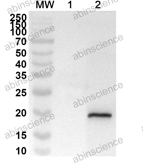 Western blot analysis was performed using anti-ASFV EP84R monoclonal antibody at 1ug/mL on various samples. Lane 1: Negative control Lane 2: Recombinant ASFV EP84R
