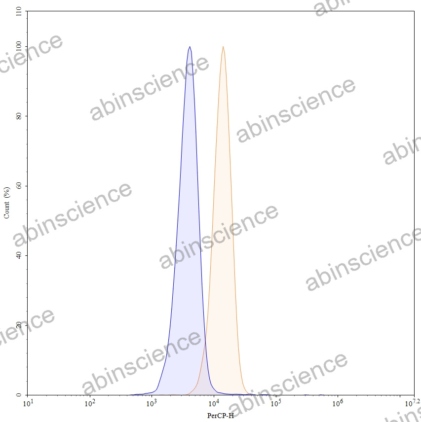 Flow-cytometry using PerCP anti-human FAP antibody. U87 cells were stained with an irrelevant antibody (Blue Histogram) or an PerCP anti-human FAP monoclonal antibody (Catalog: HC440147, Yellow Histogram) at a concentration of 5 µg/ml for 30 mins at RT. After washing, cells analysed on a NovoCyte Flow Cytometer. |