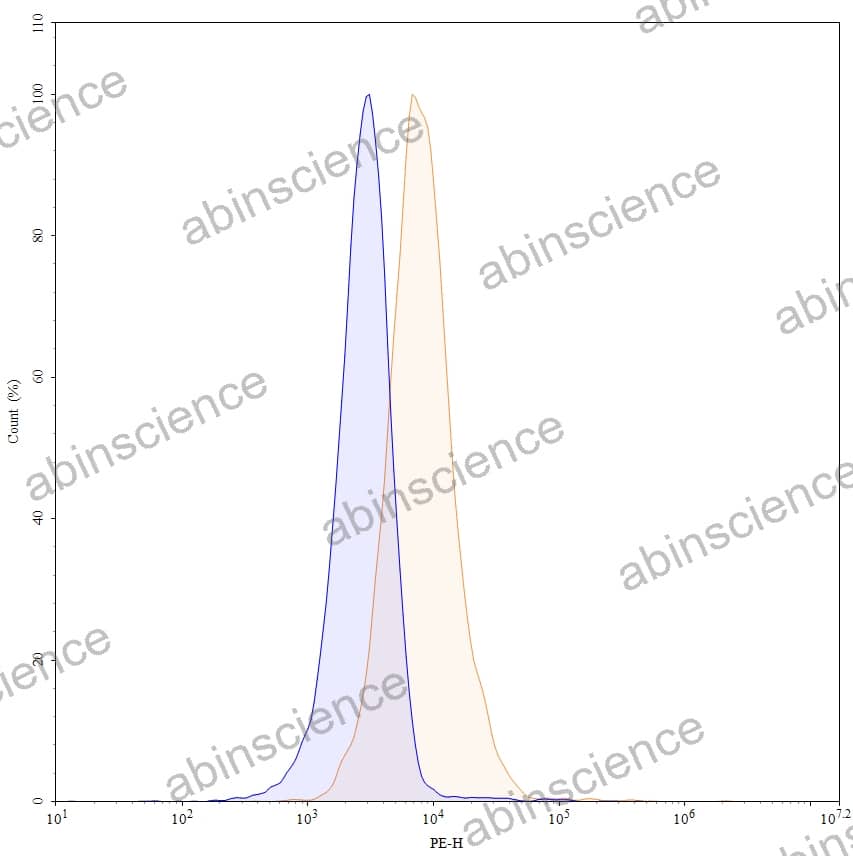 Flow-cytometry using PE anti-human CD54 antibody. RPMI-8226 cells were stained with an irrelevant antibody (Blue Histogram) or an PE anti-human CD54 monoclonal antibody (Catalog: HY321227, Yellow Histogram) at a concentration of 5 µg/ml for 30 mins at RT. After washing, and cells analysed on a NovoCyte Flow Cytometer.