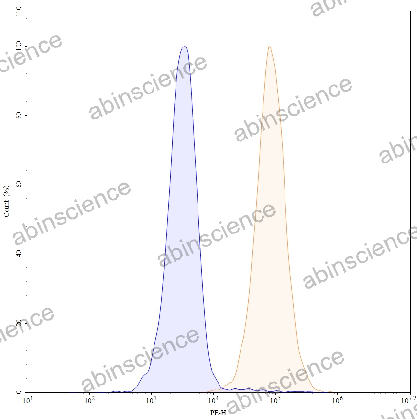 Flow-cytometry using PE anti-human CD51 antibody. HepG-2 cells were stained with an irrelevant antibody (Blue Histogram) or an PE anti-human CD51 monoclonal antibody (Catalog: HY065127, Yellow Histogram) at a concentration of 5 µg/ml for 30 mins at RT. After washing, and cells analysed on a NovoCyte Flow Cytometer. |