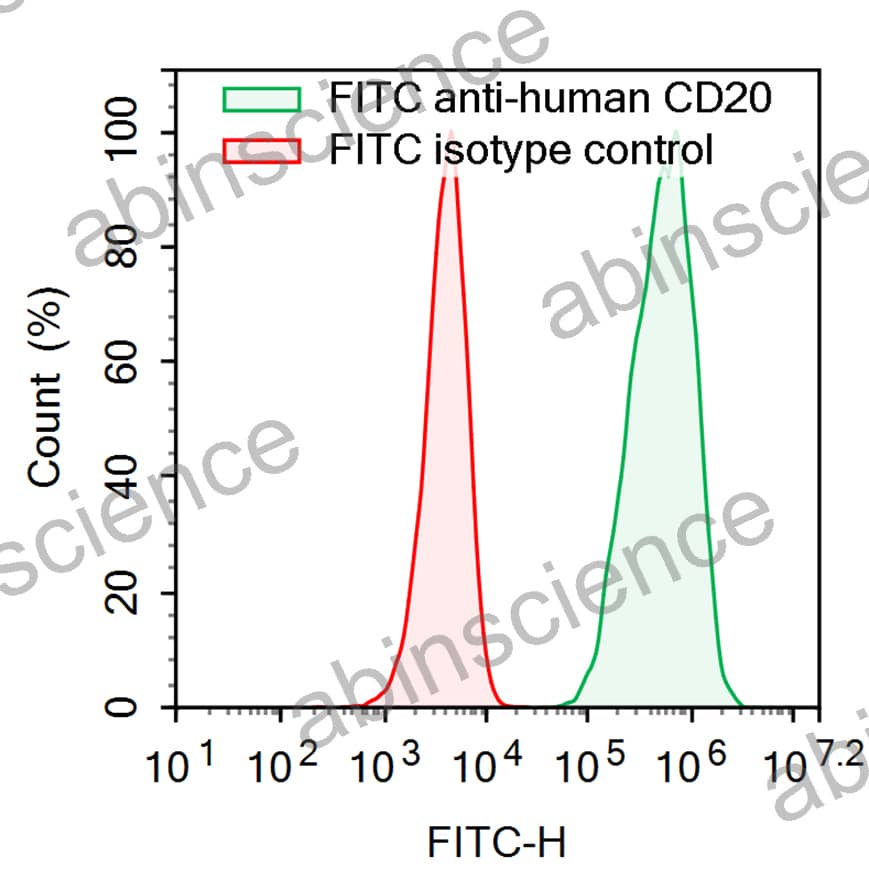 Flow-cytometry using FITC anti-Human CD20 antibody. Daudi cells were stained with an irrelevant antibody (Red Histogram) or a FITC anti-Human CD20 antibody monoclonal antibody (Catalog # HY257617 , Green Histogram) at a concentration of 5 µg/ml for 30 mins at RT. After washing, cells analysed on a NovoCyte Flow Cytometer. |