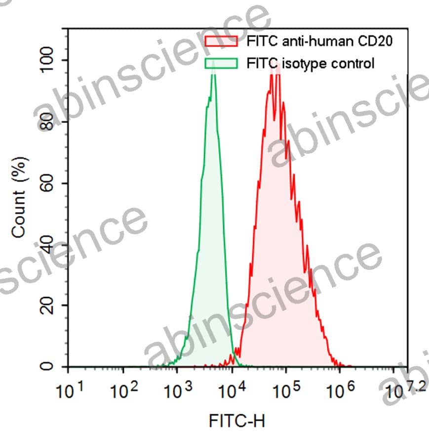 Flow-cytometry using FITC anti-Human CD20 antibody. Daudi cells were stained with an irrelevant antibody (Green Histogram) or a FITC anti-Human CD20 antibody monoclonal antibody (Catalog # HY257717 , Red Histogram) at a concentration of 5 µg/ml for 30 mins at RT. After washing, cells analysed on a NovoCyte Flow Cytometer.