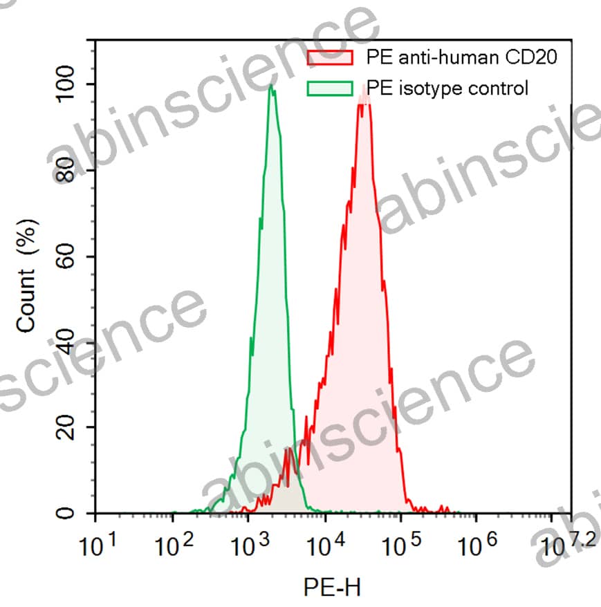 Flow-cytometry using PE anti-Human CD20 antibody. Daudi cells were stained with an irrelevant antibody (Green Histogram) or a PE anti-Human CD20 antibody monoclonal antibody (Catalog # HY257727 , Red Histogram) at a concentration of 5 µg/ml for 30 mins at RT. After washing, cells analysed on a NovoCyte Flow Cytometer.